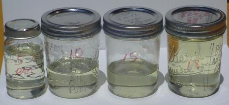 TESTING THE CLEANSED OIL FOR CLEANLINESS The use of the Water Sediment Test is a good indicator on whether the CLEANSED OIL oil contains mucilage. Care must be taken because the simple fact that two liquids, one on top the other, may just show a thin film of emulsification at the juncture point. And, the degree of mechanical filtration is another consideration, as a poor filtering will allow mucilage or other sediment to enter the oil. EXAMPLE: In using the Lavender flower, I found that the minute sized fuzz from the flower buttons can pass through the filter. The same for use of the Psyllium Husk. However, there is reason to believe that the Water Sediment Trap is a good indicator on whether the chosen cleansing method, did or did not remove the mucilage.. TRULY, only a science lab can measure the quantity of mucilage in oil, but we know the Old Masters did not have any of our modern instruments and some of them succeeded. I reject the notion that the cleansing of the oil was a complicated or time consuming process. In my opinion, the 'water washing' processes where oil is REPEATEDLY vigorously shaken with water , IS A WASTE OF TIME AND OIL. My book explains the reasons. These series of tests show the results of 1/4 inch of oil resting - NOT EVER MIXED OR SHAKEN TOGETHER- on 2 ounces of water, over several days. The results are interesting. The white paper resting beneath the jars has 2 lines. a solid black and a red. It turned out the red was not waterproof, and one morning we had a lot of DEW on the paper, causing the red to bleed. The photos speak for themselves. Continue to scroll down to see all the photos. |