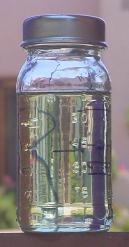 | BARLEANS UNREFINED FLAX OIL #11=On your left, is the UNCLEAN oil right out of the bottle. It is known to be full of mucilage. # 13=On your right: Barleans oil, previously cleansed by the VEL-TAUB method, then SUN THICKENED for 30 days. The oil is beginning to crystalize and dry HARD. It is pure colorless clear as it is drying on the water, as only 1/4 inch oil is resting on the water. |