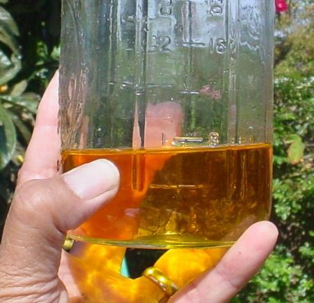 SUN THICKENING YOUR OIL IS EASY OIL can also be ' thickened" by using an electric hotplate in the winter--but the oil remains yellow. Keep the temperature very low, under 130 degrees Fahrenheit. The oil begins to decompose at 230 degrees Centigrade. Care must be taken for fire hazard and burns. Artificial heat should be done outdoors and children should be protected. THE PHOTO TO THE RIGHT, SHOWS THE OIL ONCE IT HAS BEEN SUN THICKENED FOR 30 DAYS IN HOT SUMMER SUN. = BUGS AND DIRT GET INTO THE OIL, BUT ARE EASILY FILTERED OUT. THE SUN EVAPORATES MOISTURE NATURAL TO THE OIL CREATING A FAST DRYING OIL AND IT BLEACHES THE OIL. THE EXPOSURE TO THE SUN RAYS, AIR AND HEAT CAUSES THE OIL TO BECOME VISCOUS. ALL OF THESE CONDITIONS CREATE AN OIL THAT WILL DRY WITHIN 30 HOURS OR LESS WHEN USED IN PAINT IF PAINTED THIBNLY. TUBE PAINT IS MADE WITH SLOW DRYING OIL AND THIS SLIGHTLY SLOWS THE DRYING. HAND GROUND PAINTS ARE THE FASTEST TO DRY. THE OIL MUST BE STIRRED DAILY FOR 1 MINUTE, BUT IN EXTREMELY HOT WEATHER, 2X A DAY. STIR BRISKLY TO INTRODUCE OXYGEN INTO THE OIL. |