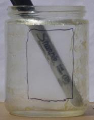 The jar has a rectangle drawn with black ink. This area in the rectangle was wiped down thinly as one would use it in applying the oil out, when oil painting. It is completely clear and transparent and it is completely emulsified and it has no yellowish color at all. Please note that the emulsion that was NOT wiped thinly is encrusted on the side of the glass jar and any discoloration is due to the thickness of the concentration. The emulsion that is stuck to the side of the jar demonstrates its adhesiveness. I shook the jar very hard and could not dislodge the emulsion that is on the jar. These photos, shown for the first time anywhere, show the beauty and wonder of the TRANSPARENCY of the Emulsions. This photo is copyright protected copyright 2008, Louis R. Velasquez Please note this photo cannot be used without my permission. |