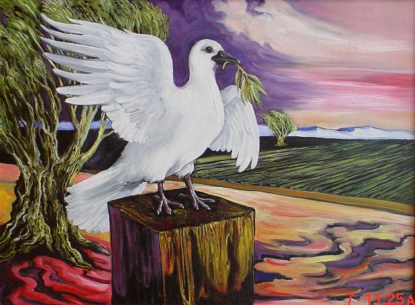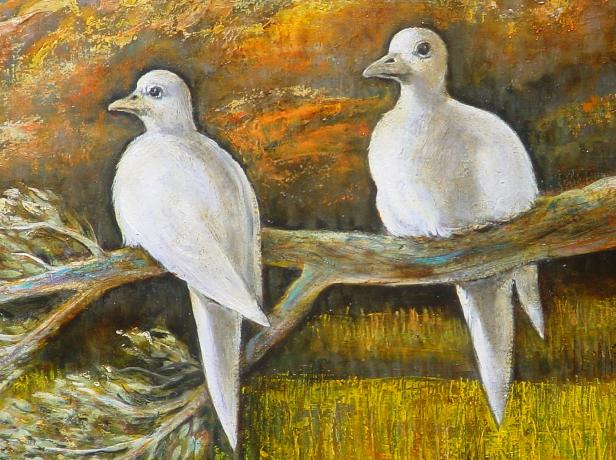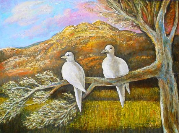 THREE WHITE DOVES IN A LANDSCAPE DATE PAINTED: May 2012 18"X 24" 1/2 inch plywood Underpainted with MILK OIL PAINT, Over painted with Calcite Sun Oil / Oil paints PRICE: $1500 CONTACT: Velapress@aol.com |