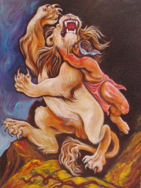 SAMPSON AND THE LION 48" X 36", OIL ON STRETCHED COTTON CANVAS FINISHED SEPT. 2012 PRICE: $5,000.- |