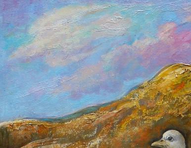 COMMENT ON THIS PAINTING: I grew up in farm country. My grandmother had a 30 acre olive ranch 7 miles north of Porterville, a small city of 6,000 people [ back then] in California. This image is from memory and imagination of things I saw as a teenager. East of Porterville are the 'ROCKY" hills and the area has lots of doves, pigeons, pheasants, quail, grape vinyards, wheat fields, olive and orange groves. The scene shows the evening as the sun begins to set. Shadows are cool and purple bluish. ORIGINALLY TITLED: " Two white doves" As I was looking at it, I "SAW" the faint image of a DOVE in the clouds-- with a bit of white, blue and red applied with my fingers, I accentuated the image of the dove in the clouds -- but without it becoming too evident. This bit of mystery, imagination, subtle fantasy and subliminal projection gives the painting an additional interest for the viewers. Thanks --Louis |