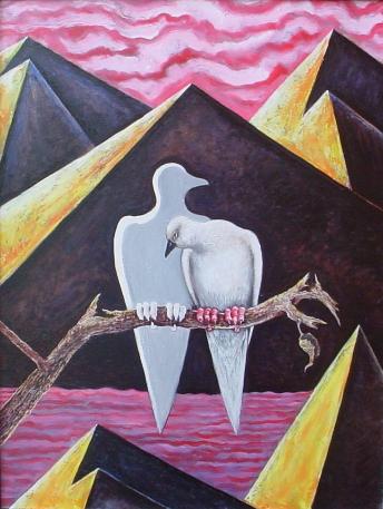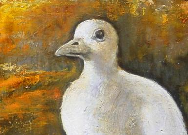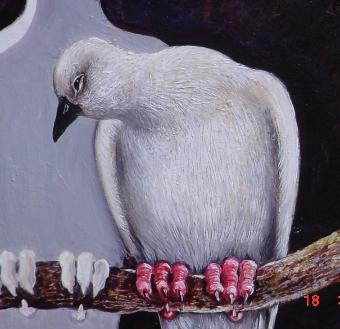 LA PALOMA TRISTE ( THE SAD DOVE) Oil on Birch plywood, 24" X 18", 2006, with detail. "Calcite Sun Oil" as the Grinding Oil creates a viscous paint, and the Emulsion is used as the thinner and the 'oil out'. Together they allow the artist to create abstracted forms or fine detailed realistic forms. Addition of dry calcite allows thick impasto when desired. |