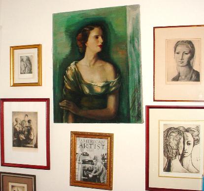I own several original Taubes Paintings. In time, I will place them all here on my site. Some are in better condition than others. The first one to your right is a portrait of his wife LILY. It is an outstanding TAUBES painting. Taubes normally did not date his paintings. But, going by the style, this painting can be guessed to be from the early 1940's. This large painting is about 40" X 30" BELOW in the photo, is my wall of honor dedicated to Mr. Taubes. A large beautiful unsigned painting, several etchings in a variety of styles, and the cover of American Artist magazine from Jan. 1943. |
