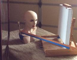 My studio with a high located window. The mannequin represents Rembrandt. The ruler has blue tape to show 26 inches. My arm extended is 26 inches. The canvas must be within arms reach to paint on it. The canvas is tilted so Rembrandt can see its surface to paint on. Very important to see that the canvas is in shadow because a projected image cannot be projected onto an illuminated surface. The canvas is on Rembrandt's left side ... as it would be for painting the very large Frick self-portrait. Rembrandts left side of his face is illuminated as it is for the Frick painting--which is a mirror reversal--falsely appearing that it is his right face that is in the light. |