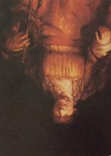 IF Rembrandt did use O'Neill's theory and mirrors, this is the position the PROJECTION would look like AS REMBRANDT TRACED THE IMAGE. IT WOULD BE UPSIDE DOWN O'Neill's theory requires Rembrandt to use a CONCAVE MIRROR used in conjunction with a FLAT MIRROR. According to O'Neill's theory, The Concave mirror projects the image of Rembrandt's face... onto the flat mirror- ...the flat mirror then relays the projection onto the canvas. IMPORTANT : The projected image and the final painting are both MIRROR REVERSED. This means that the lighted part of Rembrandt's face appears to be his RIGHT side, but in reality, it is his LEFT SIDE. I calculated that the top of Rembrandt's head begins at about 9 inches from the top of the canvas. [ 22.86 cm]. |